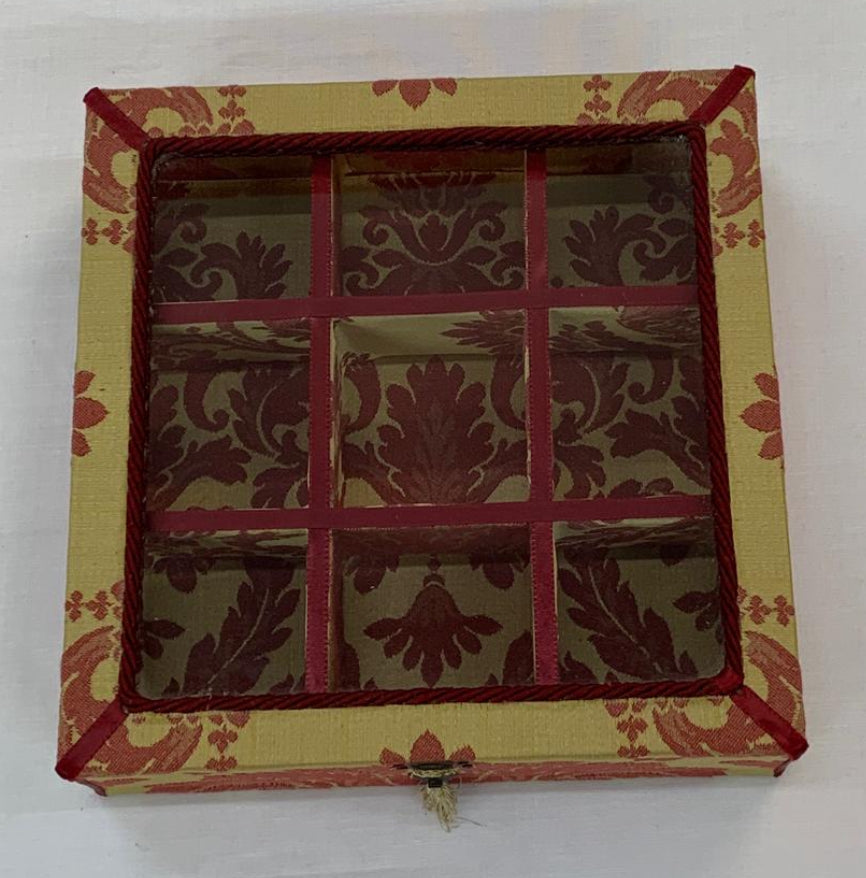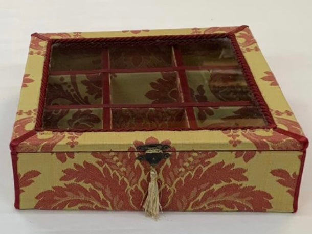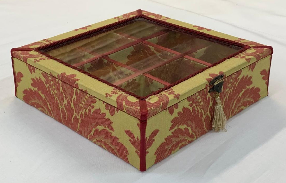 Scatola in legno rivestita in damasco giallo/rosso,misura cm 24 x 24,altezza cm 7